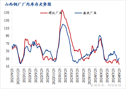 2024年初價格快速下跌,鋼廠復(fù)產(chǎn)節(jié)奏后移,對應(yīng)的庫存高點明顯回落,4月初到6月中旬價格開始逐步修復(fù)反彈,前期停產(chǎn)鋼廠逐步復(fù)產(chǎn),對應(yīng)產(chǎn)量開始增加,山西主導(dǎo)鋼廠螺紋鋼價格6月中旬在3600元/噸出廠,震蕩下跌到8月中下旬2980元/噸出廠,隨后出現(xiàn)震蕩反彈,9月份反彈過程中出現(xiàn)小波段下行,進入9月份以來,建筑鋼材基本面良性運轉(zhuǎn),庫存逐步下降致鋼廠出現(xiàn)缺規(guī)格現(xiàn)象,對價格強力反彈有較大支撐。
