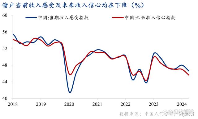 居民消費(fèi)疲乏,且表現(xiàn)為追求性價(jià)比,導(dǎo)致企業(yè)生產(chǎn)供給偏多,競爭激烈下價(jià)格注定承壓。企業(yè)利潤變薄,居民工資收入有下行壓力,而且企業(yè)繼續(xù)投資的意愿和能力均下降,工資收入預(yù)期也轉(zhuǎn)弱。央行調(diào)查顯示,今年二季度儲戶對當(dāng)前收入感受及收入信心均在下滑。