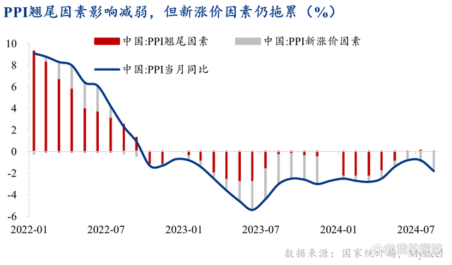 8月CPI受農(nóng)產(chǎn)品供給波動推高,而非食品尤其耐用消費(fèi)品價(jià)格低迷,暴露出實(shí)際消費(fèi)需求的疲軟。PPI持續(xù)下滑也顯示供應(yīng)大于需求的矛盾和外需見頂?shù)膿?dān)憂。GDP平減指數(shù)自2023年二季度起已連續(xù)五個(gè)季度同比下降,市場開始擔(dān)憂該指標(biāo)的通縮壓力會延續(xù)至2025年。